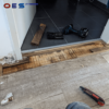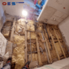 Unter dem entfernten Vinylboden war ein 3-Schicht-Parkettboden verlegt – dieser hat sich durch die massive Feuchtigkeit bereits aufgelöst.